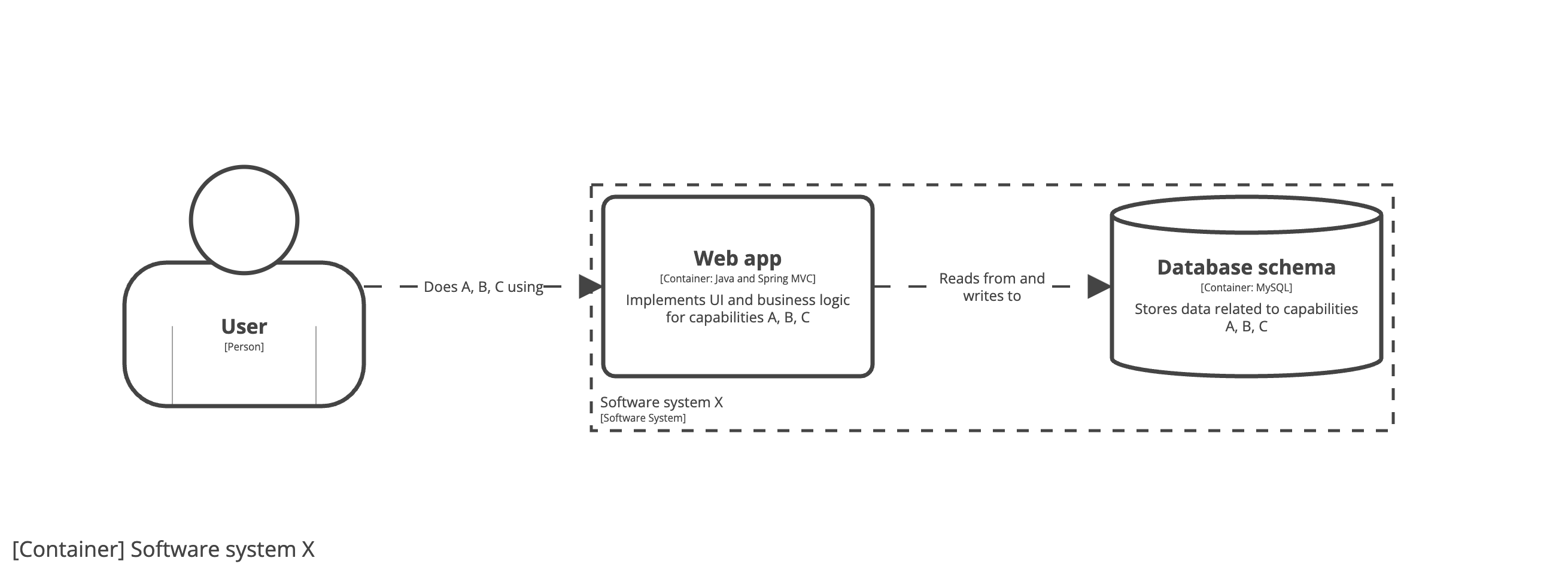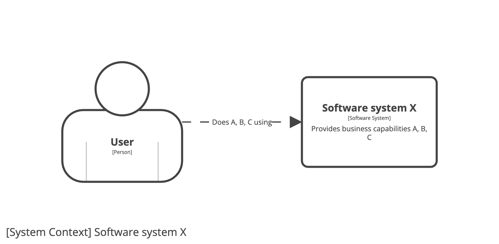 Imagine that we work for a small startup company and our task is to build a software system (named “X”) that offers business capabilities A, B, and C to our customers. Our system context diagram might look like this: