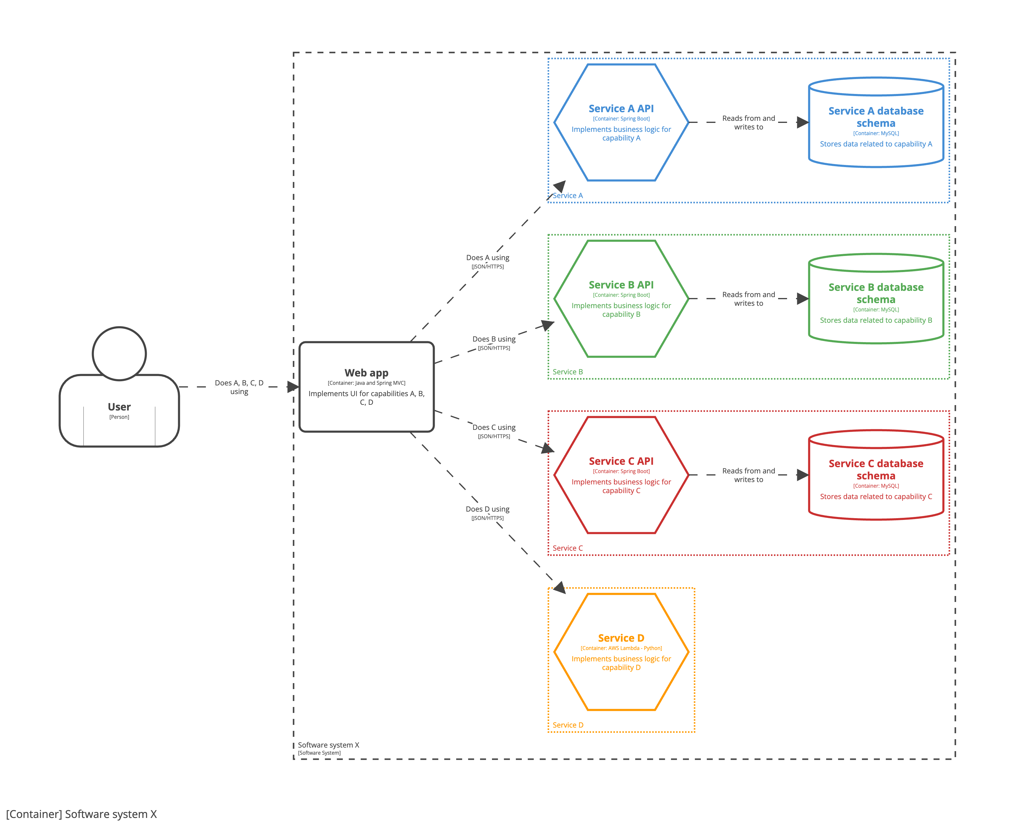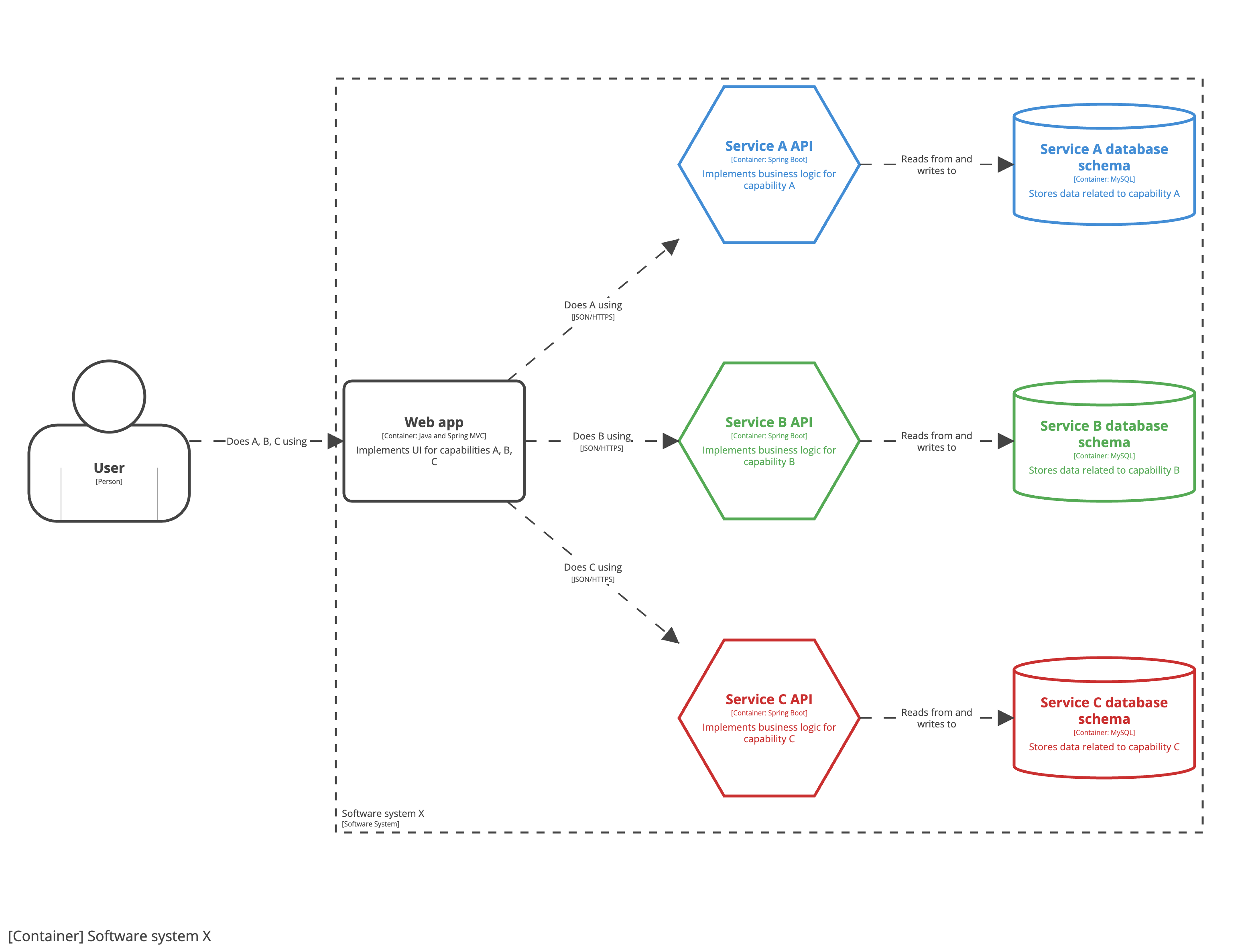 As we’re still a single engineering team, transitioning to a microservices architecture is an implementation detail that is only apparent inside the team boundary. This is why all seven containers are shown inside the software system boundary, with each “microservice” being a combination of an API container (hexagon) and a database schema container (cylinder). As a result, you will notice that this container diagram doesn’t show microservices as explicit boxes. Instead, this version of the diagram uses colour coding to show the relationship between pairs of API and database schema containers. If you wanted to be more explicit about this pairing, you could draw a box around each pair to show they are grouped together.