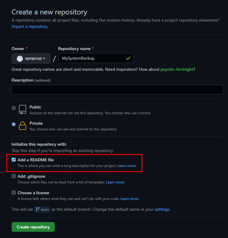 To create a new repository, only one thing is important, and that is including a single file in the repository before configuring it with GitSync. It can be done quickly by including a README file in the root of the repository when creating the repository.