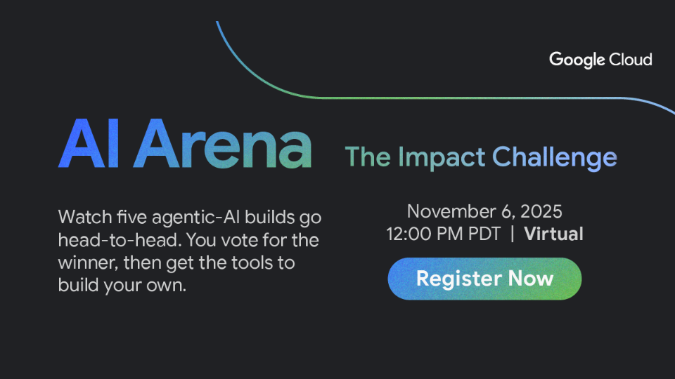 Mira a los 5 finalistas del hackathon "Agents for Impact" hacer sus presentaciones en vivo en la AI Arena el 6 de noviembre. Vota por el ganador para que haga una presentación en Next '26 y obtén acceso a herramientas de IA basadas en agentes para obtener una insignia de Credly.