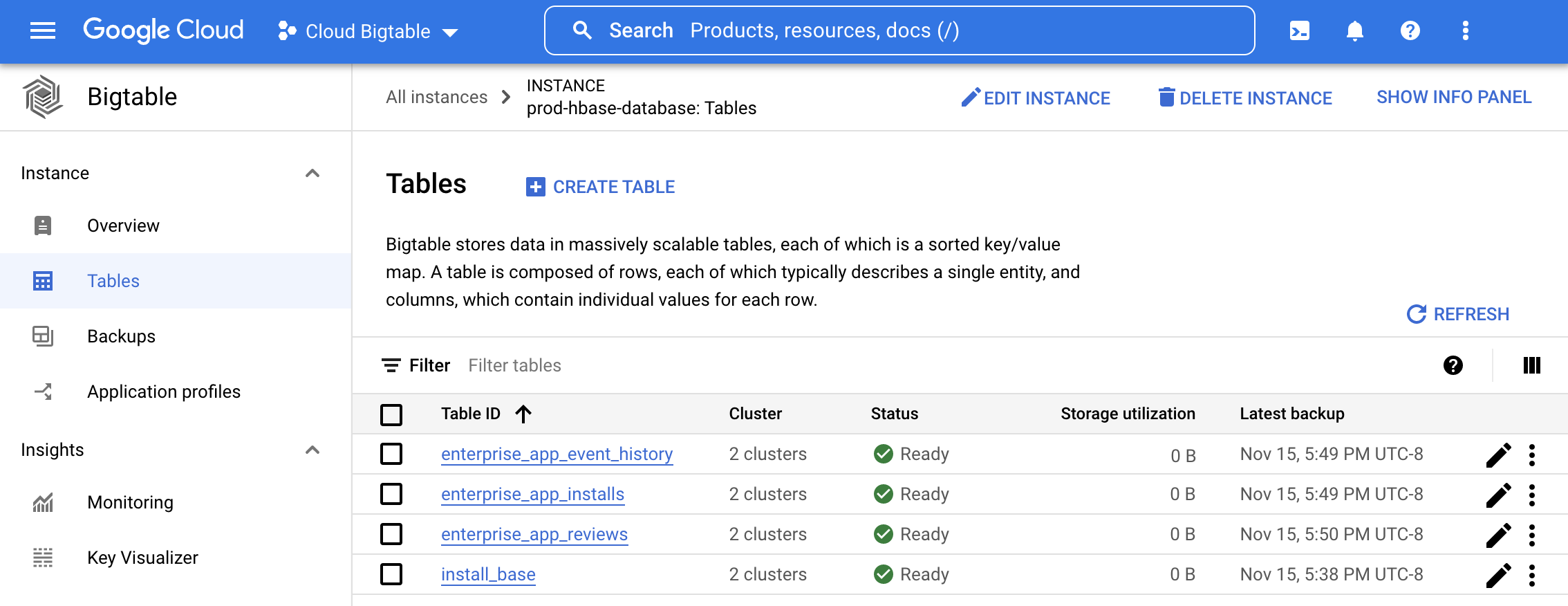 You can get started using Bigtable by creating a cluster and tables for storing data that was previously stored in HBase. Follow the steps in the Bigtable documentation for creating an instance, a cluster, and tables with the same schema as the HBase tables. For automated creation of tables from HBase table DDLs, refer to the schema translator tool.