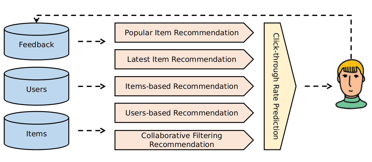 • Multi-source Recommendation: For a user, recommended items are collected from different ways (popular, latest, user-based, item-based and collaborative filtering) and ranked by click-through rate prediction.
