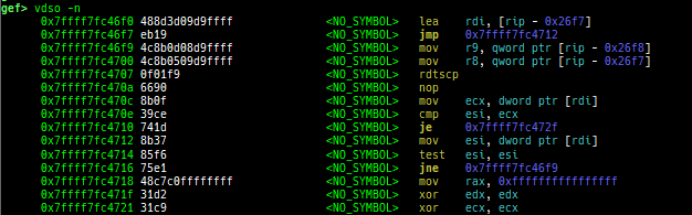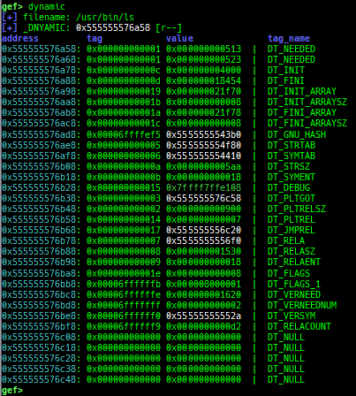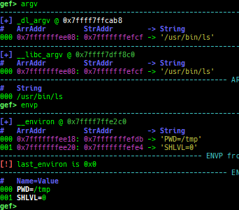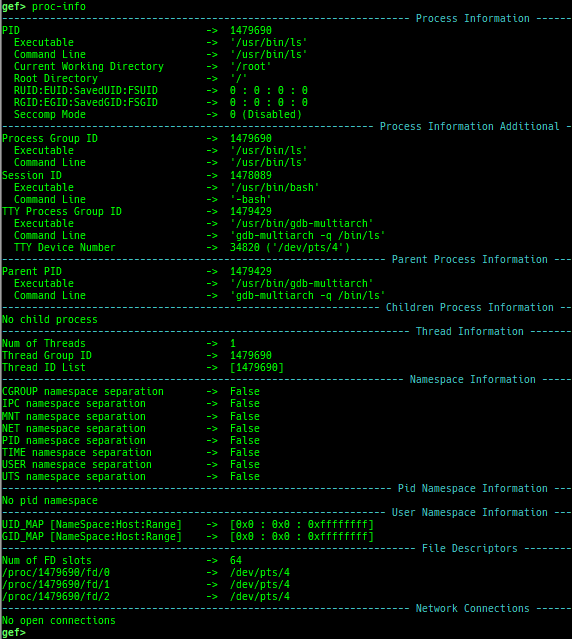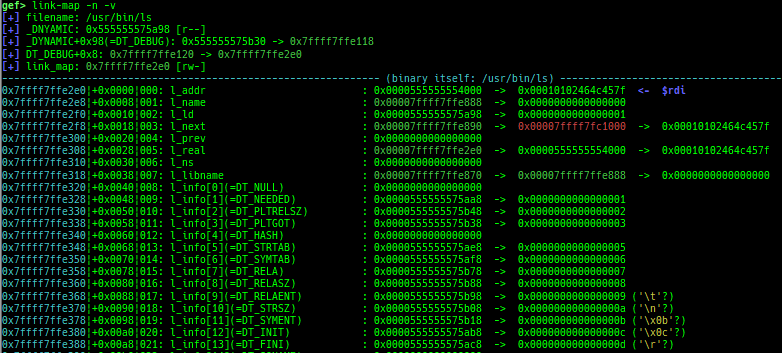 pid/tid: prints pid and tid.filename: prints filename.fds: shows opened file descriptors.auxv: pretty prints ELF auxiliary vector.argv/envp: pretty prints argv and envp.dumpargs: dumps arguments of current function.vdso: disassembles the text area of vdso smartly.vvar: dumps the area of vvar.gdtinfo: pretty prints GDT entries. If userland, show sample entries.idtinfo: pretty prints IDT entries. If userland, show sample entries.tls: pretty prints TLS area. Requires glibc.fsbase/gsbase: pretty prints$fs_base,$gs_base.libc/ld/heapbase/codebase: displays each of the base address.got-all: shows got entries for all libraries.break-rva: sets a breakpoint at relative offset from codebase.command-break: sets a breakpoint which executes user defined command if hit.main-break: sets a breakpoint atmainwith or without symbols, then continue.- This is useful when you just want to run to
