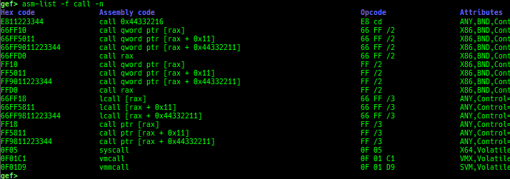 time: measures the time of the GDB command.multi-line: executes multiple GDB commands in sequence.cpuid: shows the result of cpuid(eax=0,1,2...).read-system-register: reads system register for oldqemu-system-arm.read-control-register: reads control register for kgdb.capability: shows the capabilities of the debugging process.dasm: disassembles the code by capstone.asm-list: lists instructions. (only x64/x86)- This command uses x86data.js from https://github.com/asmjit/asmdb