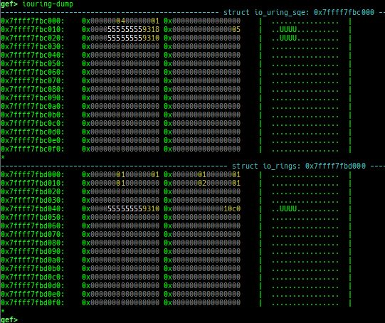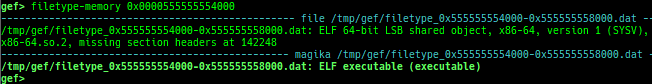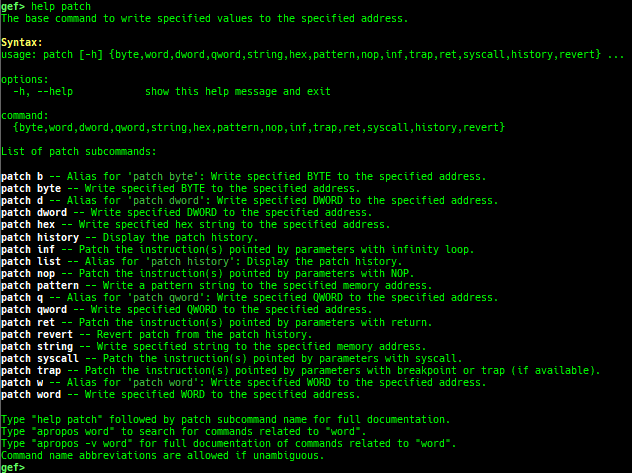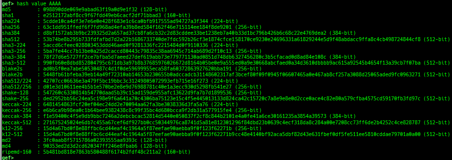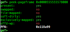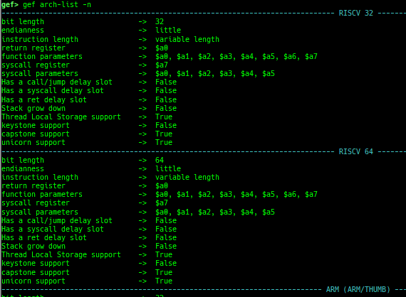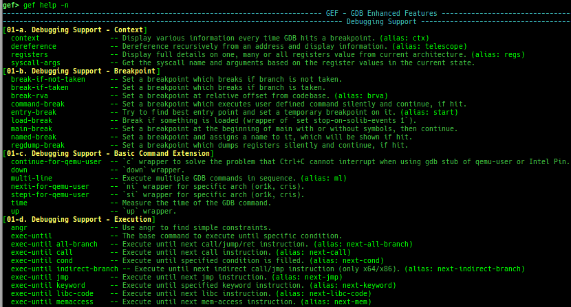 mte-tags: displays the MTE tags for the specified address.iouring-dump: dumps the area of iouring (only x64).gef version: shows software versions that GEF uses.gef status: shows architecture information used in GEF.gef reset-breakpoint: shows and resets all breakpoints.gef arch-list: displays defined architecture information.gef pyobj-list: displays defined global Python objects.gef avail-comm-list: displays a list of commands which are available or not for the current architecture and gdb execution mode.gef set-arch: sets a specific architecture to GEF.gef check-update: checks for GEF updates.binwalk-memory: scans memory bybinwalk.filetype-memory: scans memory byfileandmagika.sixel-memory: shows image to terminal byimagemagick.stdio-dump: dumps members of stdin/stdout/stderr.peek-pageframe: reads page frame data.peek-pageflags: reads page flags of a page frame.angr: finds simple constraints byangr.history: shows gdb command history easily.crc32rev: performs CRC32 reverse calculation limited to ASCII character range.vdump: visualizes memory data like an image.freq-analysis: visualizes the frequency of occurrence of each byte.qemu-system-memory-region-dump: dumps memory regions forqemu-system.find-syscall: searches the syscall gadget.fpchain: dups chains from__IO_list_all.