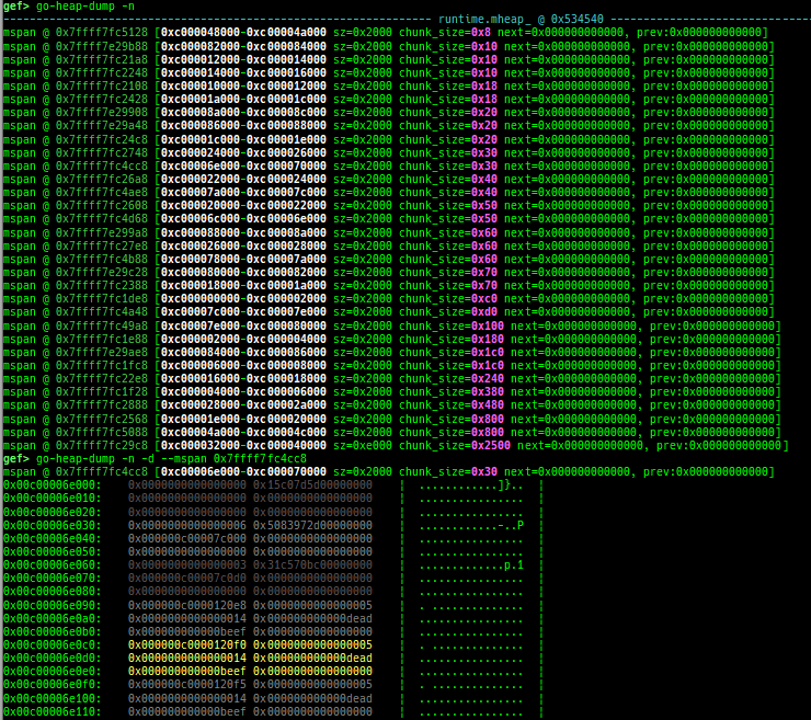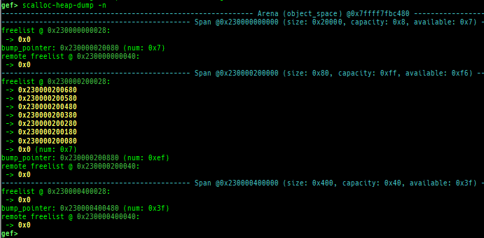 tcmalloc-dump: dumps TCMalloc (gperftools-2.16-1or namedlibgoogle-perftools{4,-dev}) free-list (only x64).musl-heap-dump: dumps Musl-Libc v1.2.5 heap chunks (only x64/x86).- How to test:
