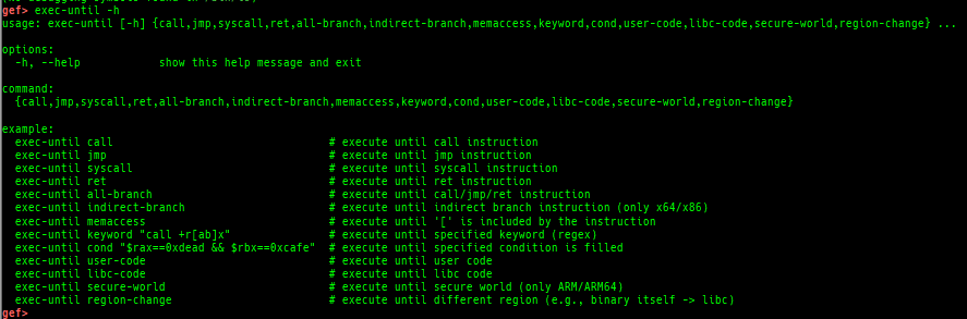 load-break: breaks if something is loaded.regdump-break: sets a breakpoint which dumps specified registers if hit.multi-break: sets multiple breakpoints easily.break-if-taken/break-if-not-taken: sets a breakpoint which breaks if branch is taken (or not taken).distance: calculates the offset from its base address.fpu/mmx/sse/avx/avx512: pretty prints FPU/MMX/SSE/AVX/AVX512 registers.xmmset: sets the value to xmm/ymm/zmm register simply.mmxset: sets the value to mm register simply.exec-until: executes until specified operation.call-trace: traces call, ret, and syscall instructions.xuntil: executes until specified address.- It is slightly easier to use than the original until command.
