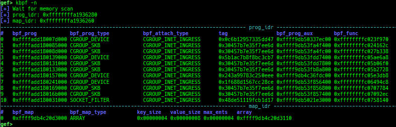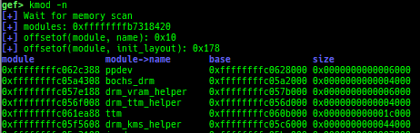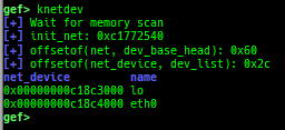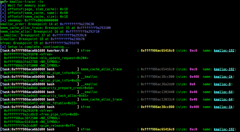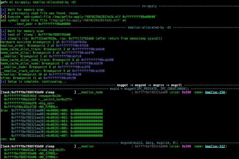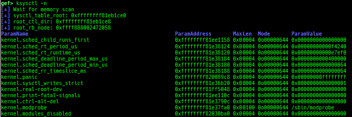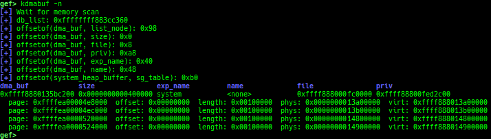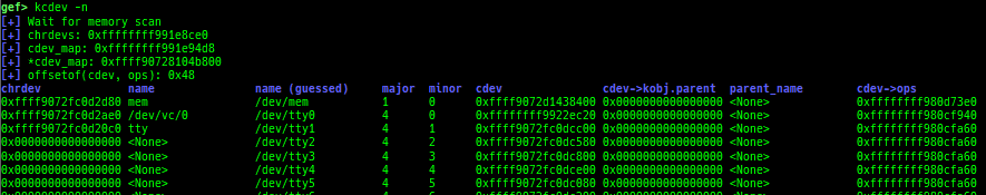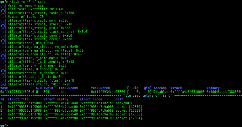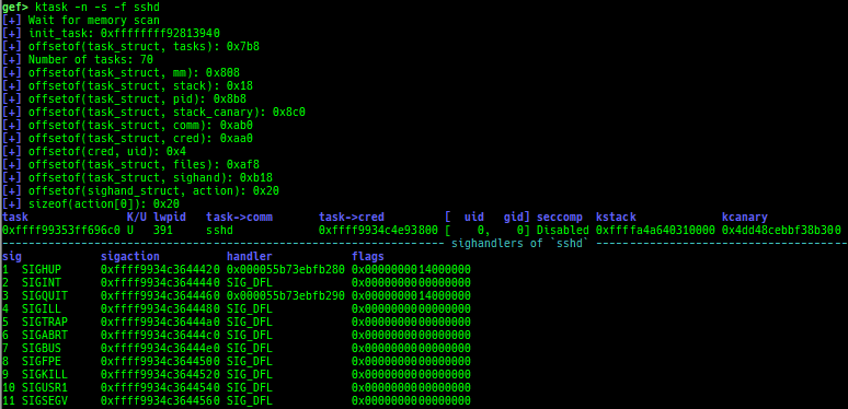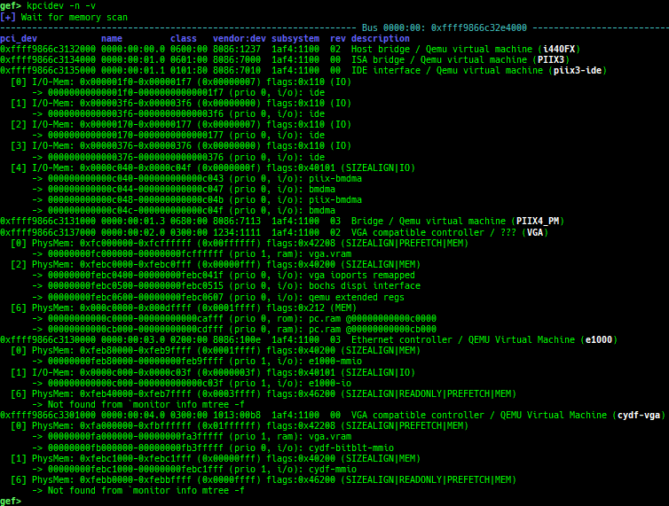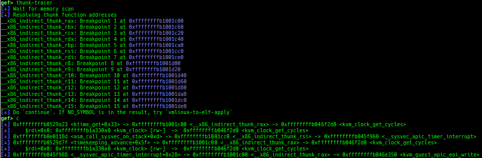 kops: displays each operation's member.kcdev: displays information for each character device.kbdev: displays information for each block device.kfilesystems: dumps supported file systems.kclock-source: dumps the clocksource list.kdmesg: dumps the ring buffer of the dmesg area.kpipe: displays information for each pipe.kbpf: dumps the BPF information.ktimer: dumps the timer.kpcidev: dumps the PCI devices.kipcs: dumps IPCs information (System V semaphore, message queue and shared memory).kdevio: dumps I/O-port and I/O-memory information.kdmabuf: dumps DMA-BUF information.kirq: dumps irq information.knetdev: displays net devices.ksearch-code-ptr: searches for the code pointer in kernel data area.thunk-tracer: collects and displays the thunk function addresses that are called automatically (only x64/x86).usermodehelper-tracer: collects and displays the information that is executed bycall_usermodehelper_setup.kmalloc-tracer: collects and displays information whenkmalloc/kfree.kmalloc-allocated-by: calls a predefined set of system calls and prints structures allocated bykmallocor freed bykfree.ktrace: traces kernel functions and arguments.xsm: dumps secure memory when gdb is in normal world.wsm: writes the value to secure memory when gdb is in normal world.bsm: sets the breakpoint to secure memory when gdb is in normal world.optee-break-ta: sets the breakpoint to the offset of OPTEE-Trusted-App when gdb is in normal world.optee-smc-service-dump: dumps OPTEE SMC services.optee-ta-dump: dumps the information of OPTEE-Trusted-Apps from the memory or specified host directory.optee-shm-list: shows the information of dynamic shared-memory buffers.pac-keys: pretty prints ARM64 PAC keys.uefi-ovmf-info: dumps addresses of some important structures in each boot phase of UEFI when OVMF is used.qemu-device-info: dumps device information for qemu-escape.