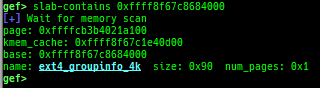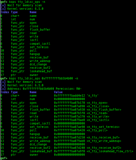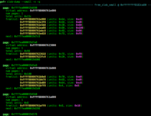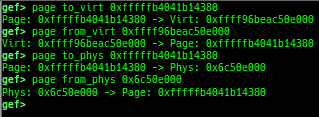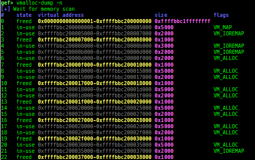 slab-dump: dumps slab free-list.slob-dump: dumps slob free-list.slub-tiny-dump: dumps slub-tiny free-list.slab-contains: resolves the slab cache (kmem_cache) that a certain address (object) belongs to (forSLUB/SLUB-TINY/SLAB).buddy-dump: dumps the zone of the page allocator (buddy allocator) free-list.vmalloc-dump: dumpsvmallocused-list and freed-list.page: displays the transformation between astruct pageand its virtual/physical address.slab-virtual: displays the transformation between slab-meta and its slab-data/struct pageaddress (forCONFIG_SLAB_VIRTUAL=y).kchecksec: checks kernel security.kmagic: displays useful addresses in the kernel.kconfig: dumps the kernel config if available.syscall-table-view: displays the system call table.ksysctl: dumps the sysctl parameters.ktask: displays each task's address.- It also displays the memory map of the userland process.