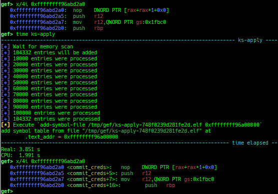 v2p/p2v: displays the transformation between virtual addresses and physical addresses.xp: is a shortcut for physical memory dump.qreg: displays the register values from qemu-monitor (allows getting values like$cseven under qemu 2.x).sysreg: pretty prints system registers.msr: reads/writes MSR (Model Specific Registers) value by embedding/executing dynamic assembly.cet: displays Intel CET settings.vbar: displays ARM/ARM64 vector table.kbase: displays the kernel base address.kversion: displays the kernel version.kcmdline: displays the kernel cmdline used at boot time.kcurrent: displays current task address.kvmmap: prints kernel memory map.ksymaddr-remote: displays kallsyms information from scanning kernel memory.ksymaddr-remote-apply/vmlinux-to-elf-apply: applies kallsyms information obtained byksymaddr-remoteorvmlinux-to-elfto gdb.- Once you get a symboled pseudo ELF file, you can reuse and apply it automatically even after rebooting qemu-system.