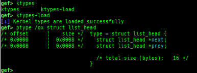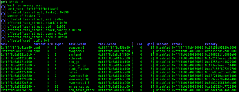 ktypes: displays kernel type information from scanning kernel memory.ktypes-load: loads kernel type information from scanning kernel memory.slub-dump: dumps slub free-list.- Supported on x64/x86/ARM64/ARM +