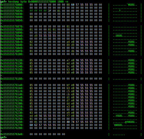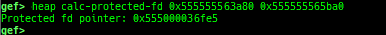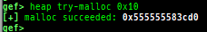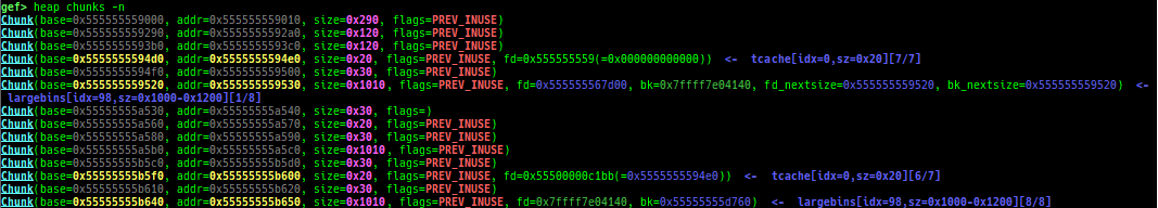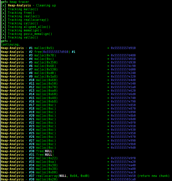 heap arenasheap topheap bins-simple: displays the heap like pwndbg style.heap parse: displays the heap like as Pwngdb/angelheap style.heap try-mallocheap try-freeheap try-reallocheap try-callocheap tcache-index-helperheap find-fake-fast: searches for a memory with a size-like value that can be linked to the fastbin free-list.heap extract-heap-addr: analyzes tcache-protected-fd introduced from glibc-2.32.heap calc-protected-fd: calculates a valid value as protected fd.heap visual-heap: is colorized heap viewer.heap tracer: has been integrated fromheap-analysis-helperand rewritten.