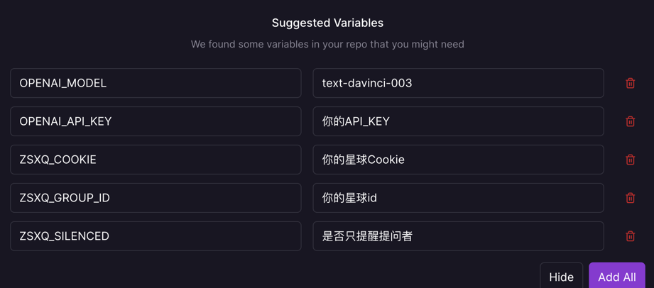 点击上述部署按钮后,会自动识别环境变量,改成自己的就可以了: