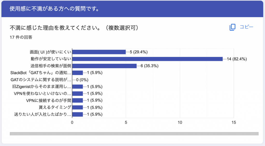 使用感に不満がある、と答えた社員のうち、82%が動作の安定性について、30%がUXなどの使いやすさについてでした。