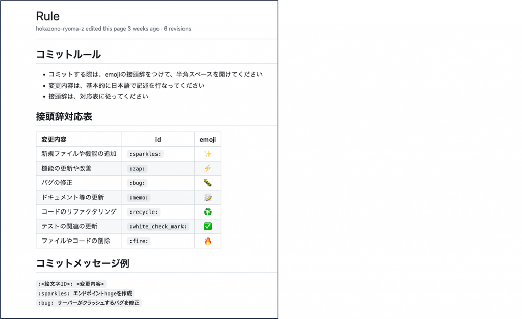 実装開始前に、コミットメッセージのルール制定を行いました。