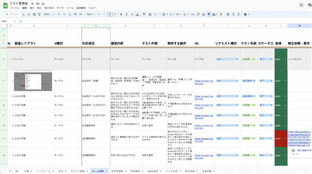 各画面ごとにテストシートを作成することで、テストする側がどのようなテストを行ったのか、どこのテストが完了しているのかを把握しやすくしています。