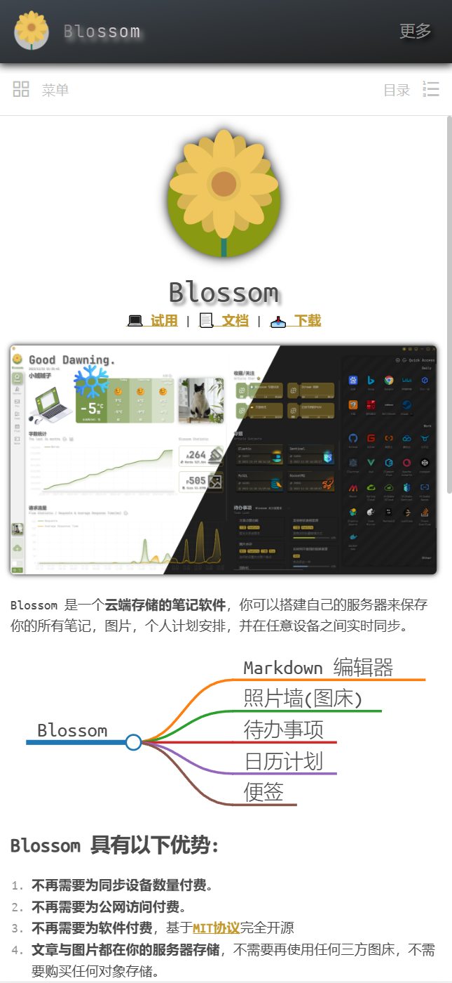 Blossom 是一个支持私有部署的云端双链笔记软件,你可以将你的笔记,图片,个人计划安排保存在自己的服务器中,并在任意设备之间实时同步。同时还是一个动态博客。
